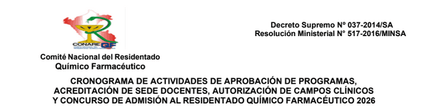 CRONOGRAMA DE ACTIVIDADES DE APROBACIÓN DE PROGRAMAS, ACREDITACIÓN DE SEDE DOCENTES, AUTORIZACIÓN DE CAMPOS CLÍNICOS Y CONCURSO DE ADMISIÓN AL RESIDENTADO QUÍMICO FARMACÉUTICO 2026