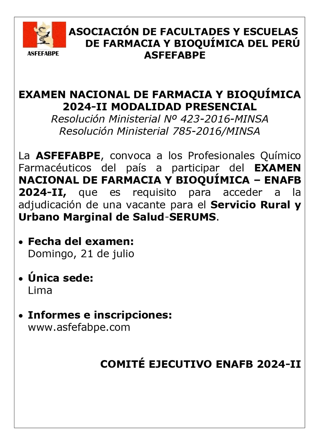 ¡Atención Profesionales Químico Farmacéuticos! La ASFEFABPE tiene el placer de anunciar la convocatoria para el EXAMEN NACIONAL DE FARMACIA Y BIOQUÍMICA – ENAFB 2024-II. Este examen es fundamental para aquellos que aspiran a una vacante en el Servicio Rural y Urbano Marginal de Salud-SERUMS.
